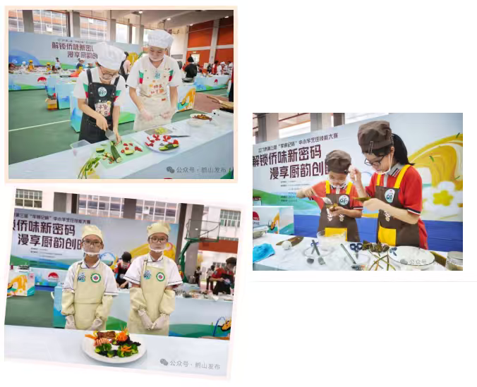 而同期举办的烹饪技能大赛更是亮点频出、精彩纷呈。赛事依据学段精心划分为小学、初中、高中及中职四组,为不同年龄段的学生搭建起展示烹饪技能与劳动风采的广阔舞台。赛场上,选手们各显神通,“凤凰于飞”“陈香琥珀叠翠”“归侨故里”等一道道创意菜品惊艳亮相。这些佳肴不仅色香味俱全,更巧妙融入美好的寓意与浓郁的五邑侨乡特色,生动展现出新时代青少年对本土文化的传承之心与创新之力。
